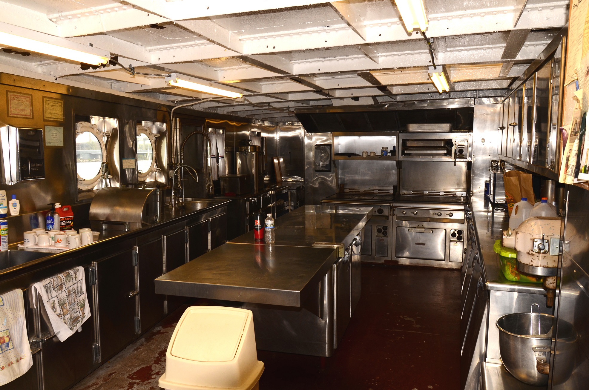 For a self-guided tour of the Schoonmaker, we boarded her in a light rain forward of amidships. With the threat of a stronger storm approaching, we gingerly made along the slick deck to the cover of the vessel’s stern-house. This rear structure houses the ship’s galley, crews’ mess, officers’ dining room, and cooks’, crews’, stewards’ and engineers’ cabins. Two decks below is the engine room, a space extending from under the main deck to the floor covering the bilges. A mezzanine-styled deck midway down divides the engine room. This deck houses the generators and electrical distribution panels.